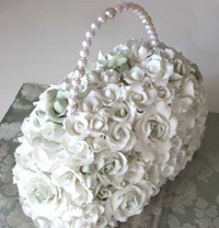 オフホワイト色でバラををひきつめ、同じオフホワイトのリボンで隙間に可愛らしさをアレンジしています。(お写真では、同じセットでヘアーアクセサリーも載っていますが、クセサリーは別途料金がかかります。)