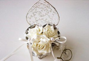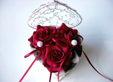 ハートのシルバーに 一枚・一枚・丁寧に軸から作った薔薇を3つ乗せ、周りに刺繍の入ったおリボンを飾りました。リングを乗せる部分には、真珠にリボンを巻き 可愛く仕上げましたお色は 中から順に薄くアレンジされたピンクです。